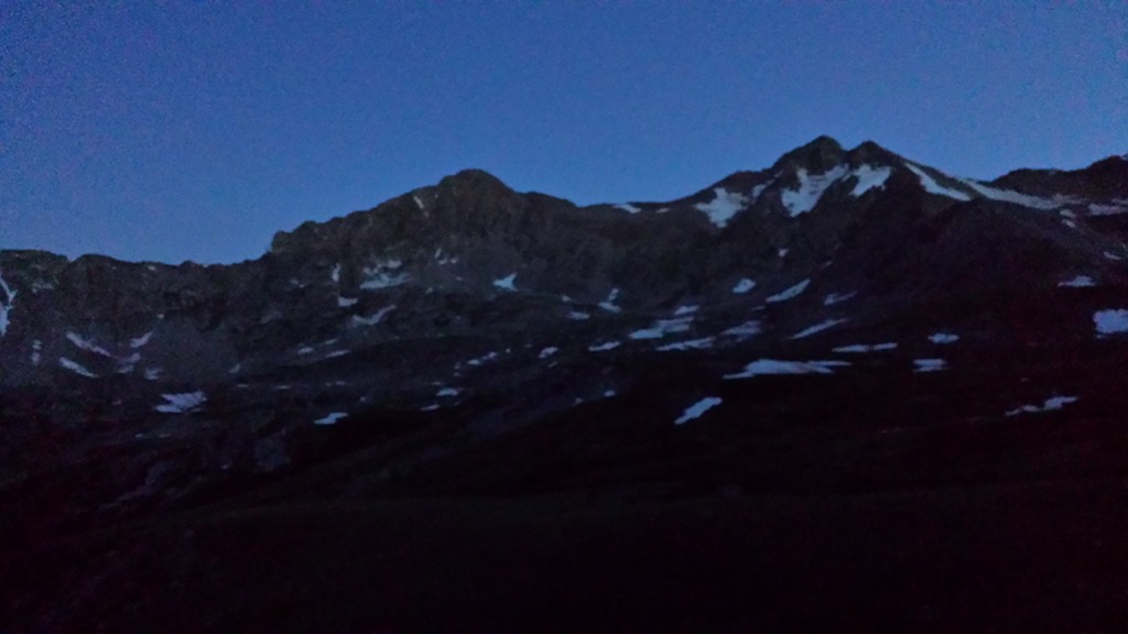 So I have been toying with this idea of summiting 30 14ers before I turn 30 this November. What better time to start this challenge than the last day of a long holiday weekend? After a Friday and Saturday full of fireworks, beer and soccer I was ready to get the 14er season started! I packed up my car and left Denver around 6:00 p.m, made it to the trail head just a little after 8:00 p.m., Set my alarm for 2:45 a.m and made myself as comfortable as one can get in a Subaru Impreza. The night was filled with tossing, turning and very little sleep, I will definitely be sleeping in a tent during the rest my 14er adventures. Around 2:30 a.m. I gave up trying to sleep, threw on my pack and headlamp and hit the trail.